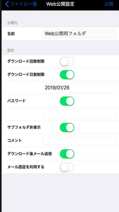 ワンタイムURLでファイルやフォルダを公開する「Web公開」設定が可能です。