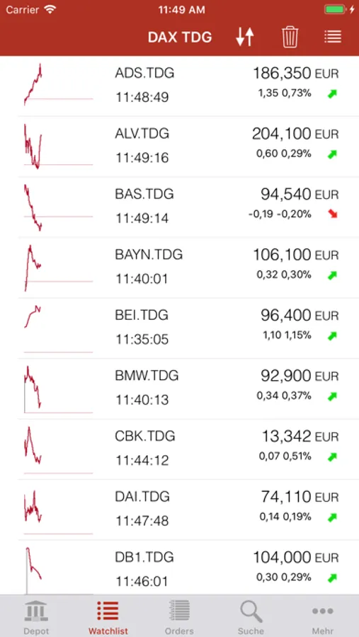 Legen Sie eine Watchlist an und sehen Sie Ihre abonnierten Realtime Kursdaten für jeden Handelsplatz. Öffnen Sie direkt in der Watchlist mit einem Klick die Ordermaske oder einen Chart. Das entsprechende Wertpapier und der Handelsplatz sind bereits voreingestellt.