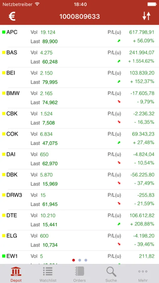 In der Depotübersicht finden Sie alle aktuellen Positionen und deren Entwicklungsverlauf. Öffnen Sie einfach die Ordermaske, um Positionen zu verkaufen. In das Feld „Ordervolumen“ ist Ihr Bestand bereits voreingetragen.