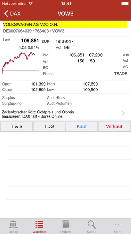 Mit dieser Funktion können Sie ohne großen Aufwand nach Wertpapieren suchen. Geben Sie dazu den Namen, das Börsenkürzel, die WKN oder ISIN ein und es werden alle relevanten Treffer zu Ihrer Suche angezeigt. Haben Sie Ihr gesuchtes Wertpapier gefunden, können Sie entscheiden, ob Sie die Ordermaske aufrufen oder das Wertpapier auf Ihre Watchlist setzen.