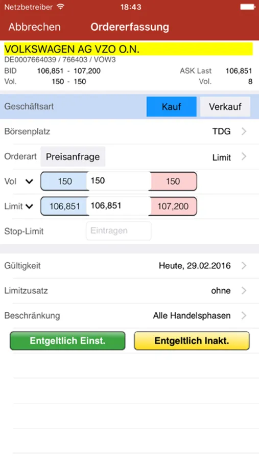 Unter dem Punkt Ordererfassung können Sie Wertpapiere kaufen und verkaufen. Nutzen Sie die Börsenkürzel WKN oder ISIN, um ein bestimmtes Wertpapier zu finden.