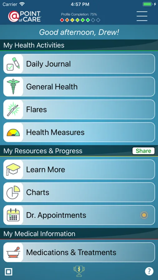 When you are living with Rheumatoid Arthritis, the RA Manager can help you manage the symptoms that affect you every day. Studies show that people with chronic diseases can positively affect their lives by using @Point of Care apps to track pain, medications, and more—giving a sense of control over their conditions.