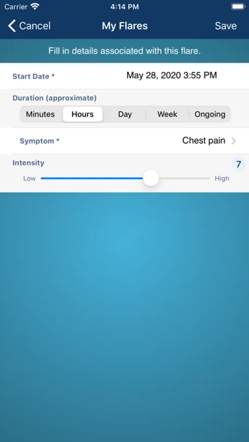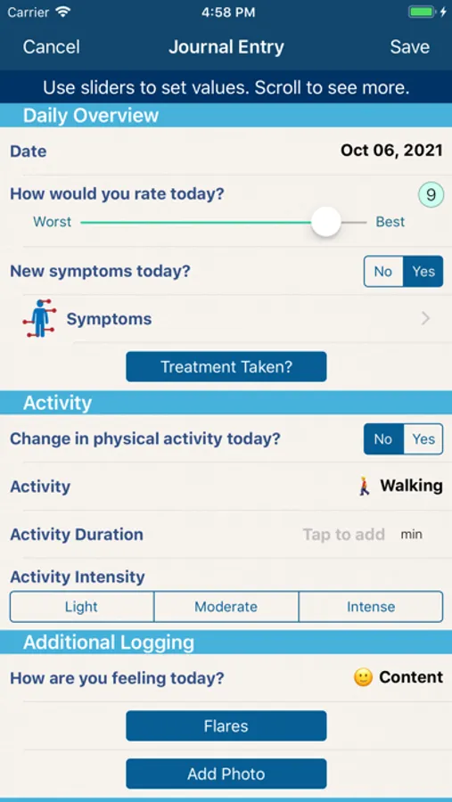 • Track your progress and symptoms by filling in the daily journal with its sliders and buttons and watch your data transform into easy-to-read charts