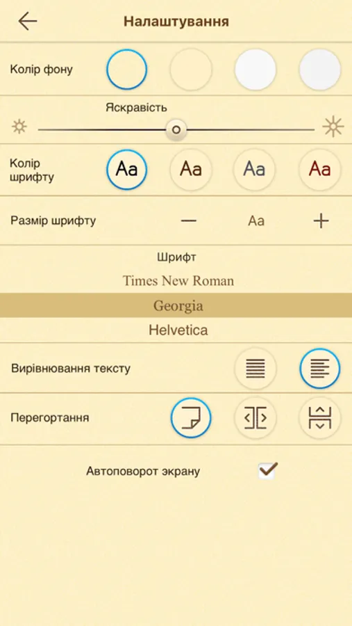 • Гнучкі налаштування відтворення тексту (вибір шрифту, кольору та фактури фону "паперу")