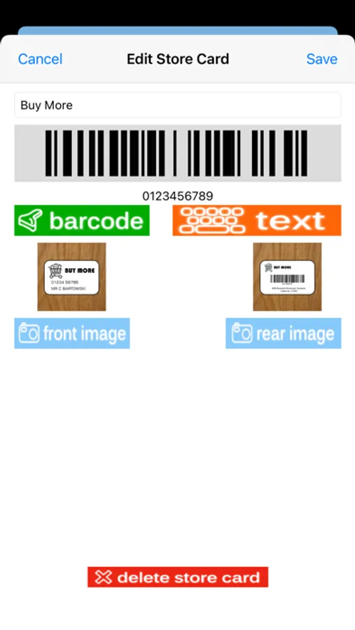 Add the card details by giving it a name, scanning the barcode, optionally take a picture of the front and back just to prove to the store it’s your card, and leave the card at home. When you need the car select it from the list and it’s displayed on the iPhone’s screen. Just ready for the clerk or assistant to scan it.