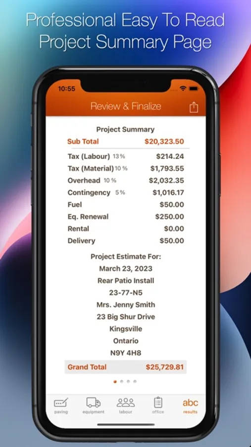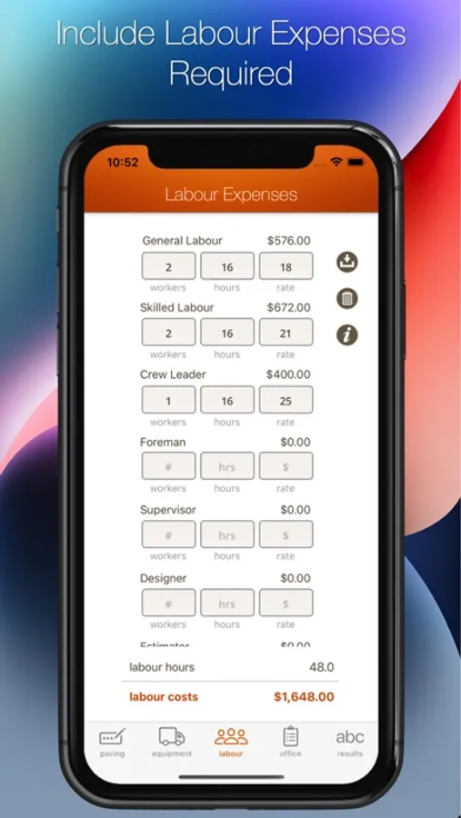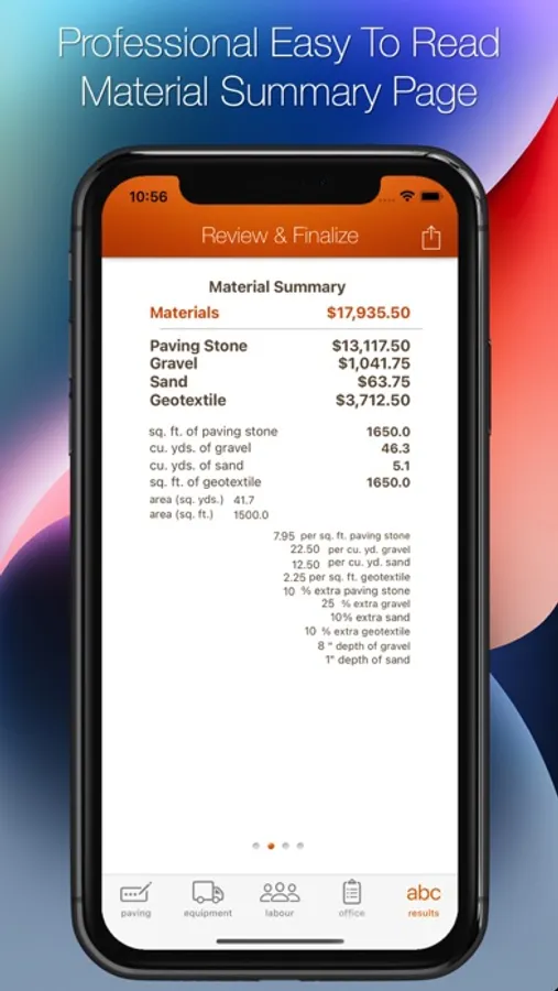 This app is our contractor / professional version as it allows you to calculate material quantities add then add costs of materials as well as labour, equipment and office costs. This is a complete all-in-one estimating and costing app for those of you doing paving stone installations.