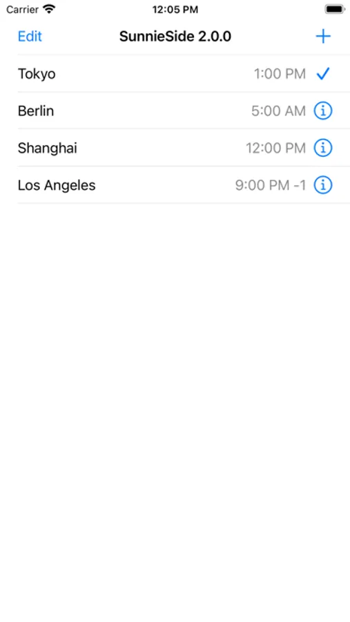 右上の+ボタンを押すとアイテム(都市)がリストに追加されます。アイテム(リスト)をダブルタップすると、時刻指定ができます。
