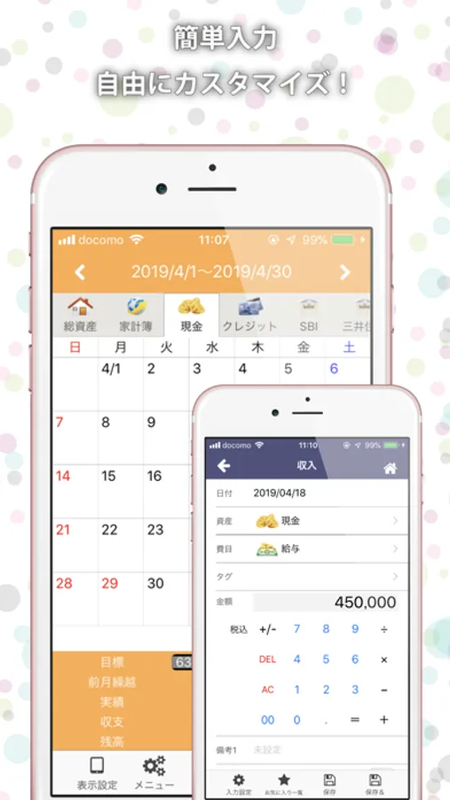 シンプルなお小遣い帳としての利用から、現金・預金・クレジット、電子マネーなどの本格的な資産(帳簿)管理まで幅広い用途に対応。