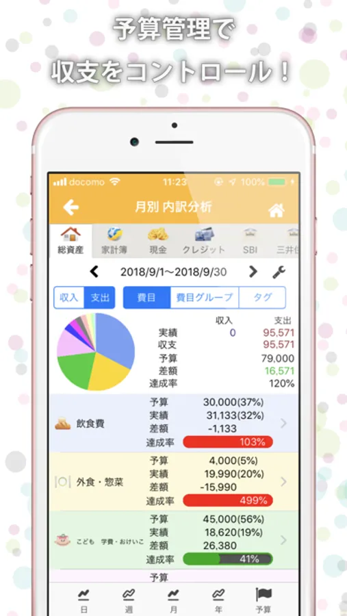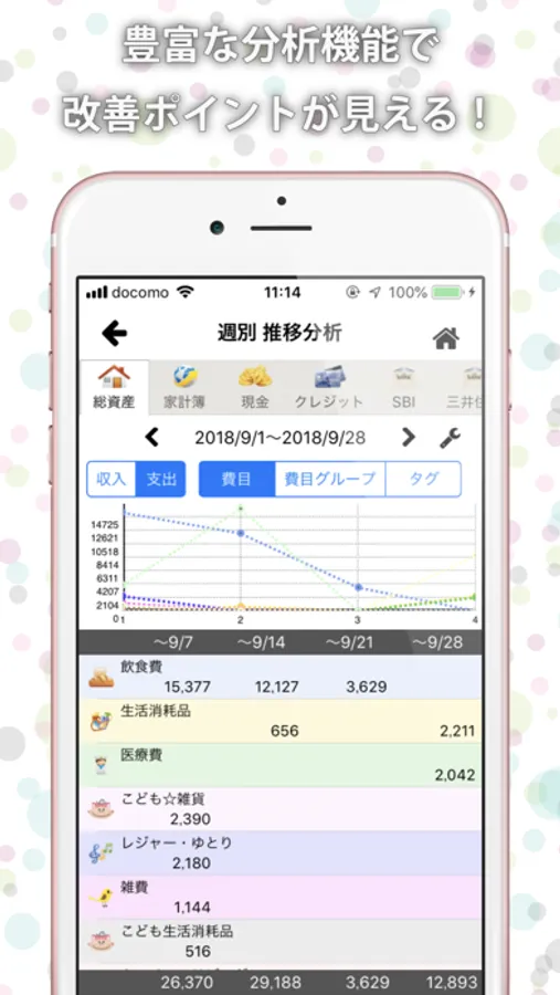 ・費用別や月間、年間、週間のグラフィカルな分析が可能で、残額もひと目で確認できます