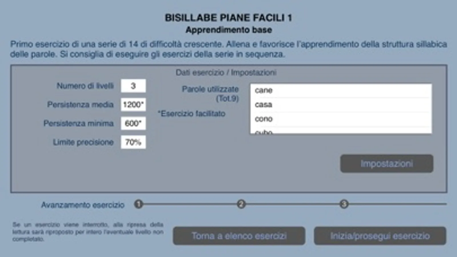 Negli esercizi, ogni elemento di una lista di parole è suddiviso nelle sue componenti sillabiche, che vengono proposte in ordine casuale e con tempi di persistenza definiti. Ciascuna sillaba appare sullo schermo, resta visibile per il tempo stabilito e poi sparisce. I tempi di persistenza diminuiscono con il procedere degli esercizi. Alla presentazione segue la risposta, che consiste nella scrittura dell’elemento che è stato mostrato e poi nascosto. La scrittura permette all’App di valutare la correttezza della risposta e nello stesso tempo costituisce un allenamento per il bambino, che oltre a ricordare la sillaba appena vista, deve eseguirne l’analisi fonemica. Dopo aver completato la lettura in sillabe, ogni esercizio prosegue presentando le parole intere, sempre con persistenza prefissata e risposte scritte. L’App contiene oltre 80 esercizi già pronti, ordinati in un percorso di difficoltà crescente, ma eseguibili anche liberamente. Ciascun esercizio è suddiviso in più livelli e utilizza una lista di parole con caratteristiche adatte ad allenare specifiche abilità. Gli esercizi di Sillabando sono dedicati a diverse aree di utilizzo: