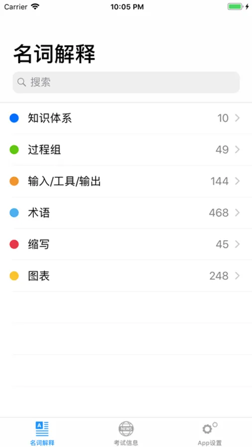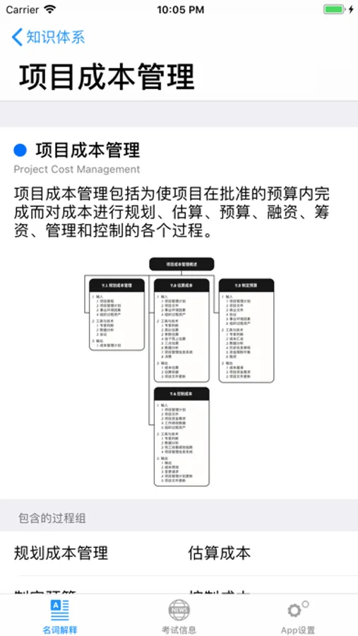 幸运PMP这个App以PMBOK第五版为基础,把整本书按照章节分解开来,让您可以快速定位和阅读。同时列举了全书中的10大知识体系,47个过程组,193个输入输出和工具,525个术语解释,和47个英文缩写,您可以检索某个关键词,查到名词解释和这个词在书中的位置,进而阅读PMBOK中关于这个词的解释的段落。