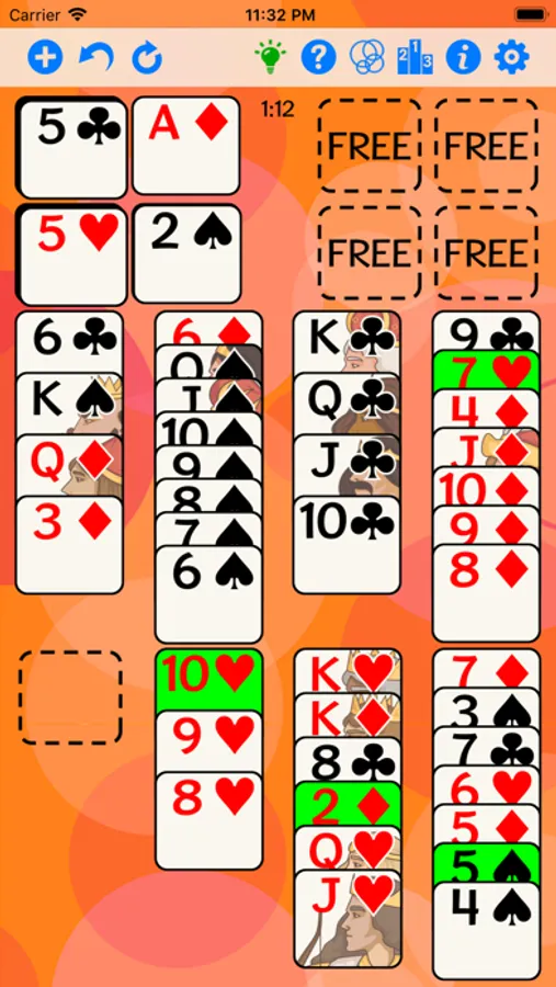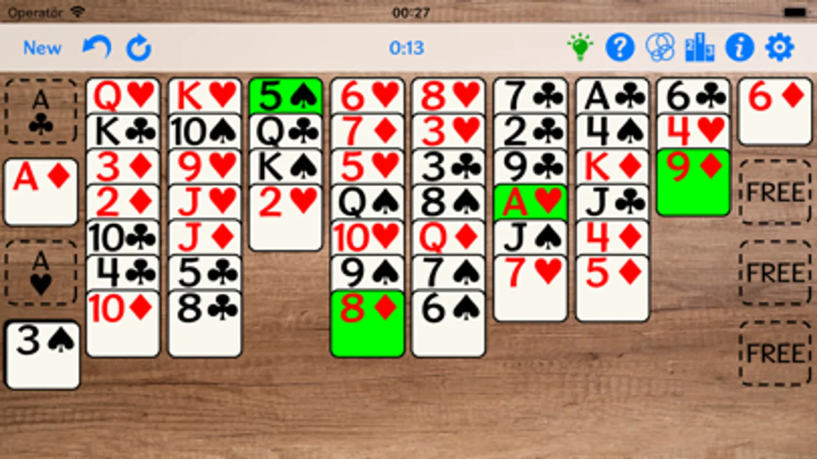 Tapping a card once will move it to a suit stack if a spot is available or to a pile with available higher card of same suit. Double-tapping a card will move it to an open free cell. Alternatively, you can simply drag a card to where you want it to go. If an attempted move is not allowed, the card will shake.