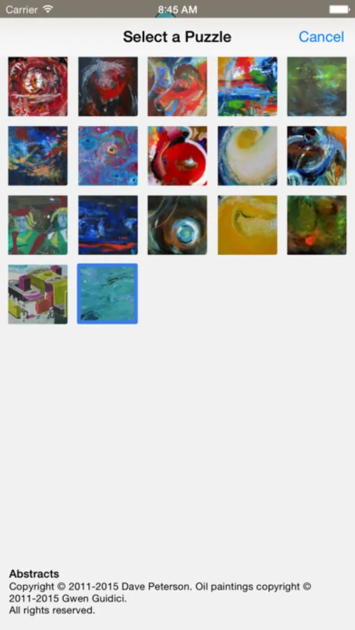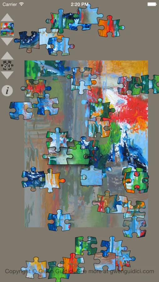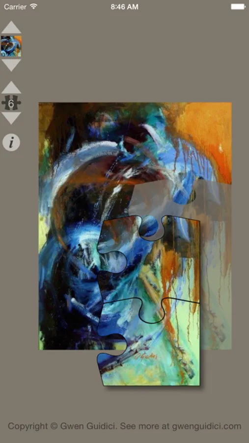 32 jigsaw puzzles of abstract oil paintings by Gwen Guidici. Choose various number of pieces from 4 to 80. Pieces snap into place, so precise positioning is not required. This app is free and supported by ads.
