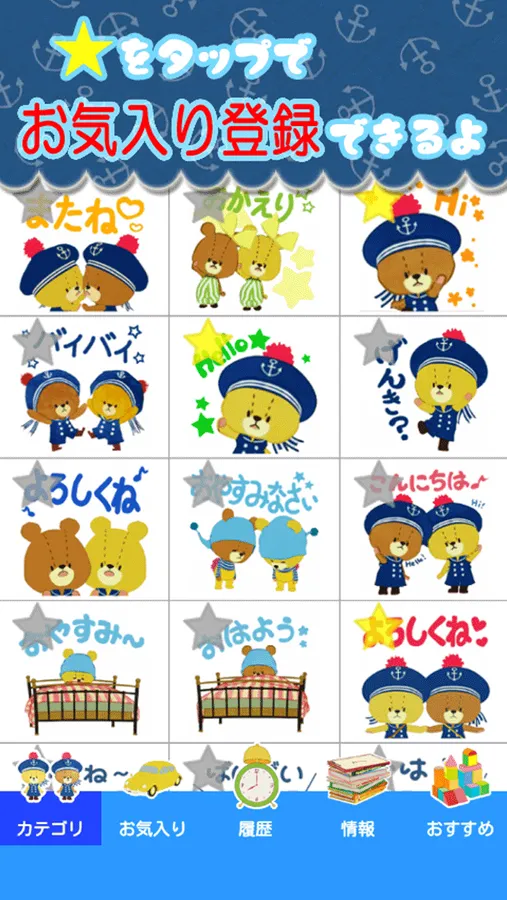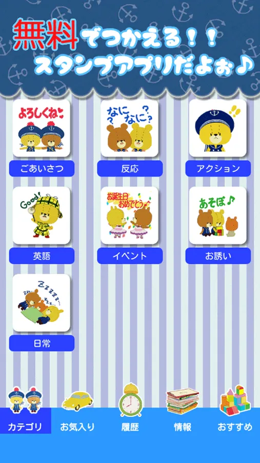 あいさつ、イベント、反応などカテゴリごとに分かれているからその時に使いたいスタンプがすぐ見つかるよ!