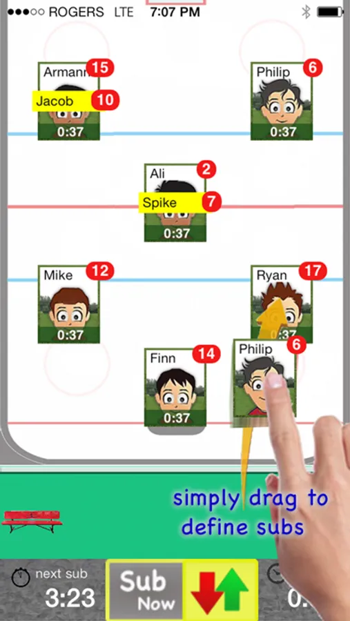 Simple drag and drop - With Who's On-Hockey, you simply drag player icons from the "bench" to "on-ice positions" as you make decisions for your starting lineup or substitutions. The app remembers "who" you've assigned "where" and tracks how long each player has been in each position during the game.