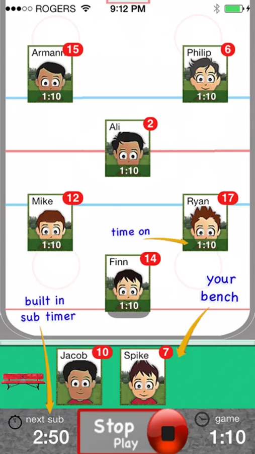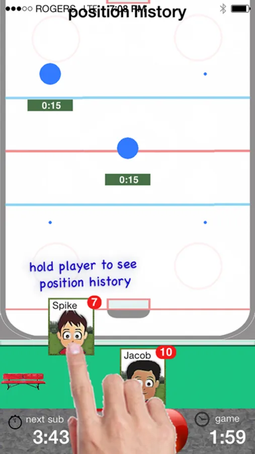 1-button rotation - When it's time to make substitutions, you press one button to indicate that the subs have taken the ice and the app records this event. The app then places the icons of the players coming off the ice back on the bench ready for their next rotation assignments.