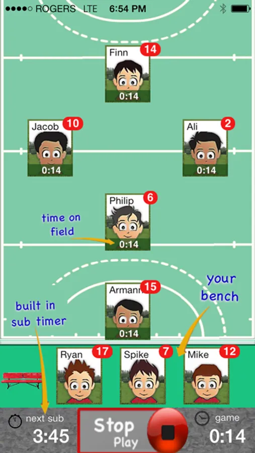 1-button rotation - When it's time to make substitutions, you press one button to indicate that the subs have taken the field and the app records this event. The app then places the icons of the players coming off the field back on the bench ready for their next rotation assignments.