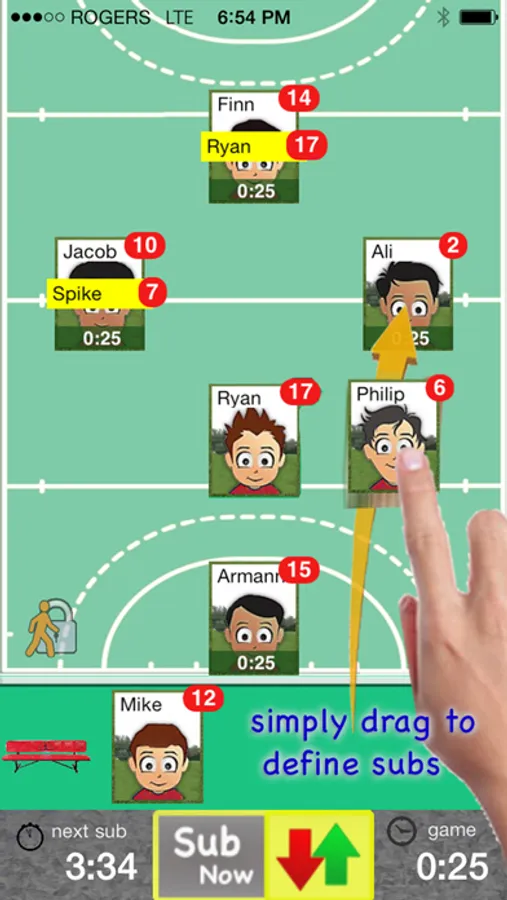 Simple drag and drop - With Who's On-Field Hockey, you simply drag player icons from the "bench" to "field positions" as you make decisions for your starting lineup or substitutions. The app remembers "who" you've assigned "where" and tracks how long each player has been in each position during the game.