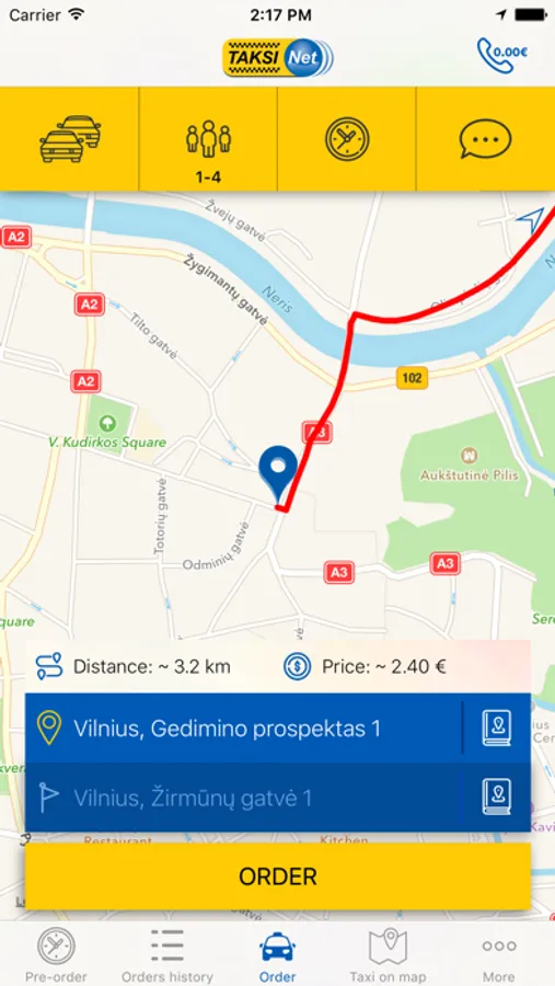 „Taksinet“ programėlė automatiškai nustatys Jūsų buvimo vietą, kelionės atstumą bei kainą.