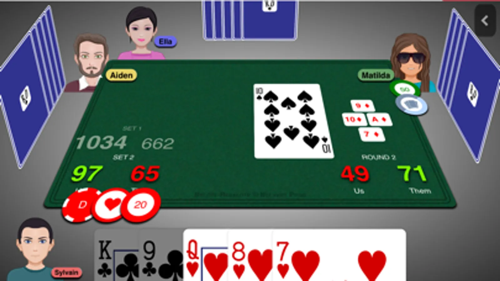 Play Belote with classic rules or `Coinchée` or `Contrée` or `Bridge-Belote`
