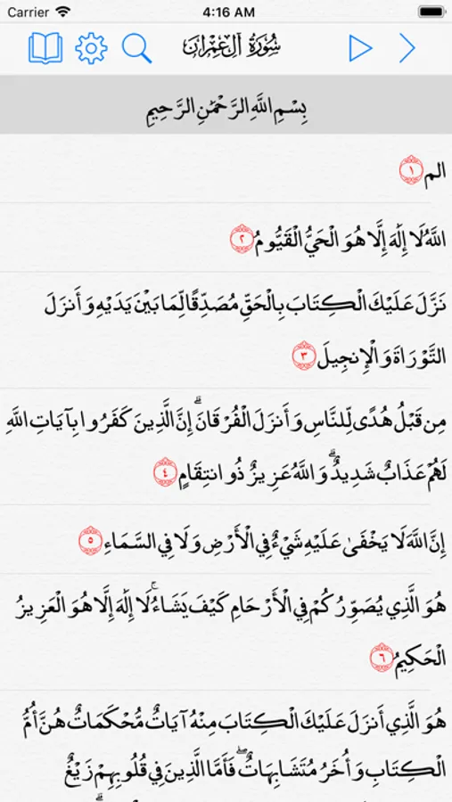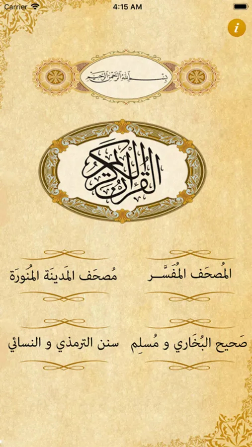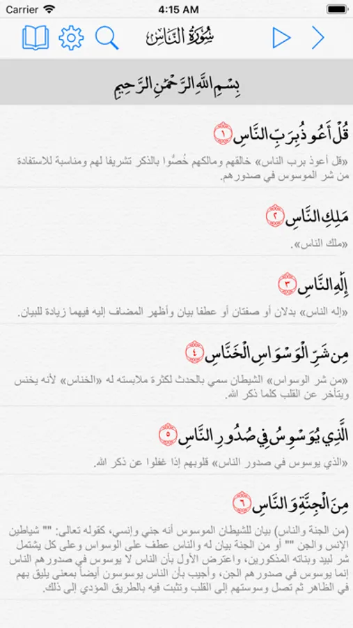 1- المصحف المفسر و فيه يتم عرض السورة كاملة بصورة متتابعة، و يمكن الوصول لأي آية بكل سهولة، مع بدء التلاوة من الآية المختارة بصورة منفردة أو متتابعة. و يمكن إختيار خط عرض الآيات من أربع خطوط متميزة حسب رغبة المستخدم. و أيضا إمكانية عرض التفسير أو نص الآية فقط.