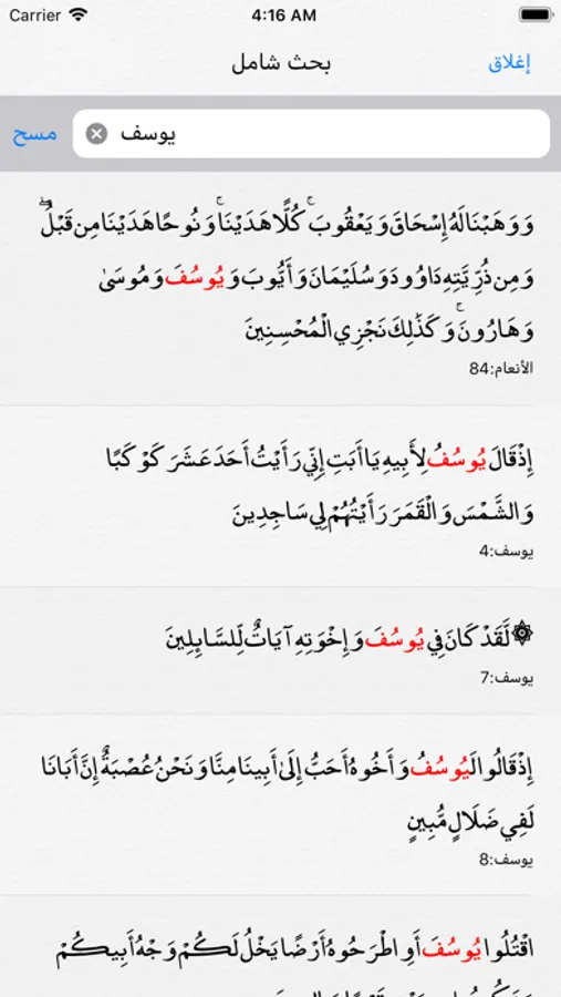 6- إمكانية البحث النصي في القرآن مع عرض جميع الآيات الناتجة عن البحث و الوصول للآية المطلوبة بكل سهولة.