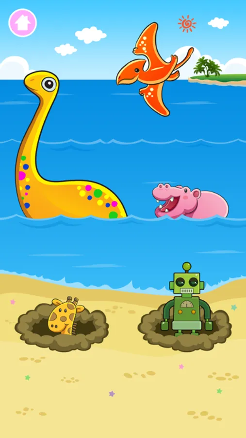 Animals appear from the ocean or beach. Play by touching the animals before they hide. Sometimes a dinosaur appears flying in the sky.