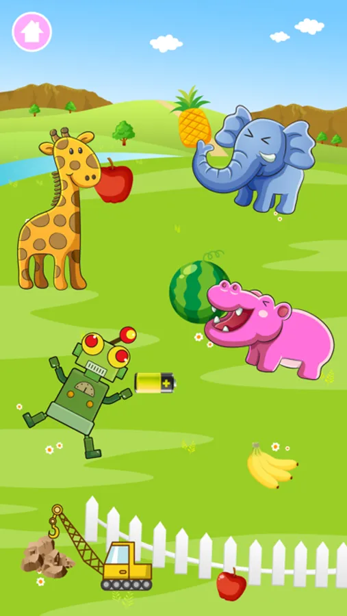 You can feed animals fruit by touching the screen. Let's feed the animals a variety of fruits like bananas, apples, and watermelons.