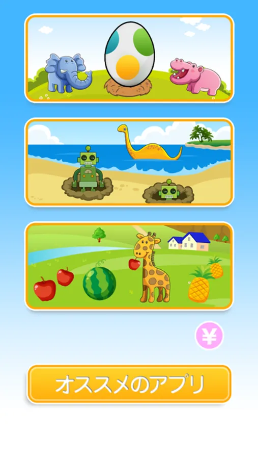 ・Three stages are available: an "Egg" stage where animals appear from eggs, and a "Whack-a-mole Stage" where animals appear from the ocean or beach, and "Feeding" stage where you can feed animals fruit.