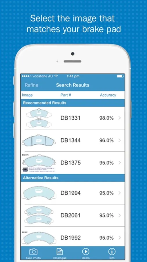 - The app will automatically identify the brake pad and provide you a part number and other specifications accurately and within seconds