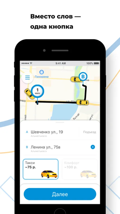 Откройте приложение, укажите адрес и закажите такси, нажав на одну кнопку.