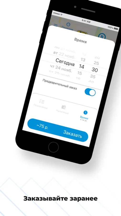 Нужен автомобиль к определенным времени и дате? Закажите его заранее через приложение, и в назначенное время такси будет ждать вас у подъезда.