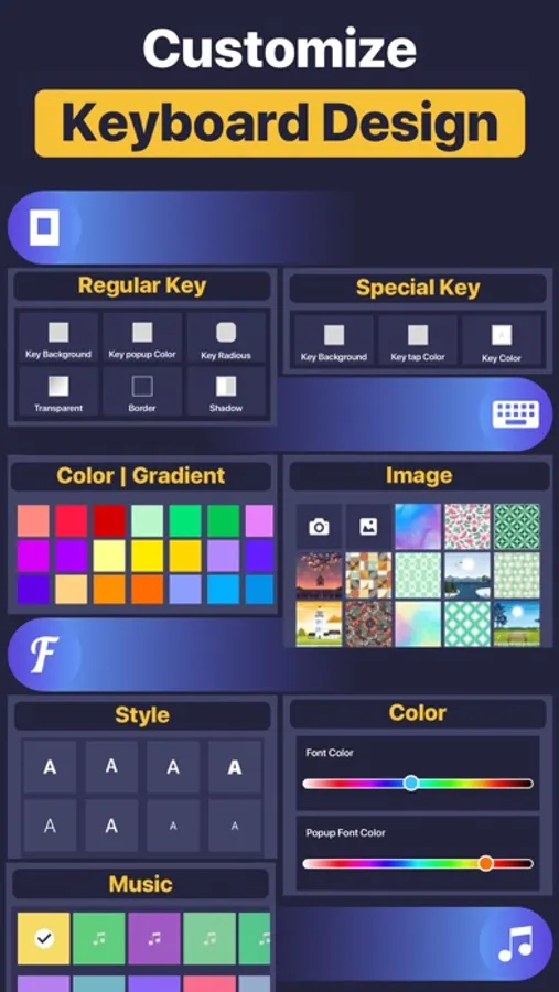 Font Changer allows you to create colorful keyboard themes and change backgrounds, button colors, keypress colors, and fonts.