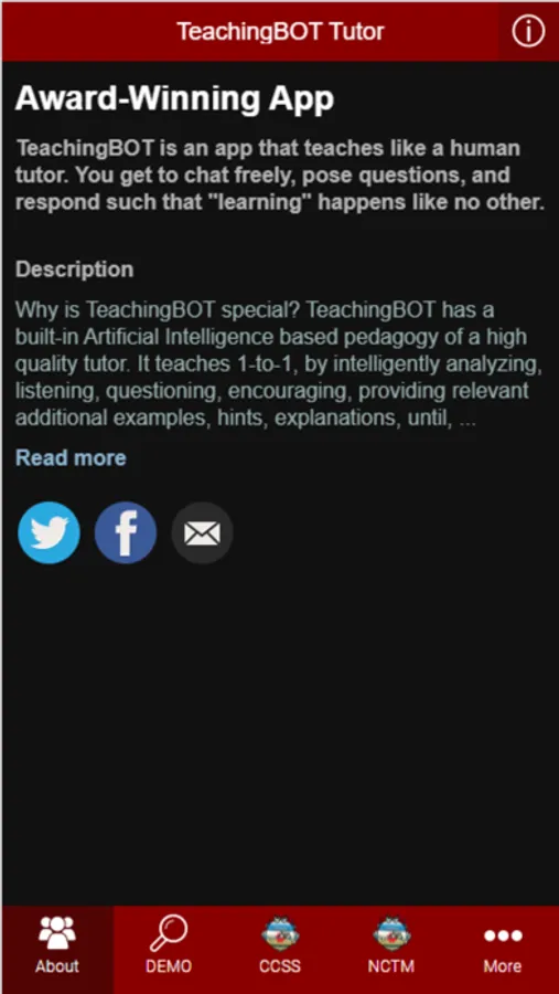 Award-Winning TeachingBOT is an app that teaches like a human tutor. You get to chat in natural language, pose questions as needed, and respond in such a way that "learning" happens like no other.