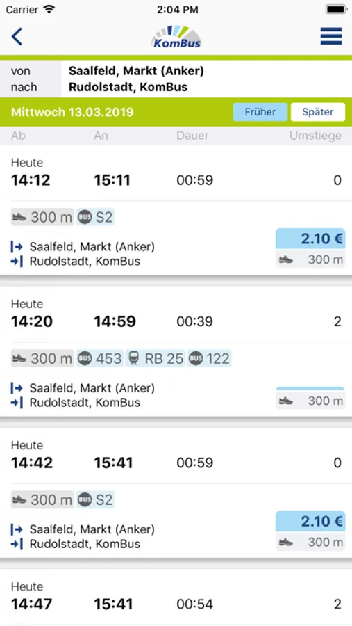 Aktuelle Informationen aller Verbindungen, einschließlich An- und Abfahrtszeiten, Umstiege, Verspätungen und Preise