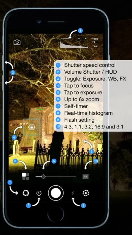 Please note that this app does not provide true night vision functionality. The iPhone, iPad and iPod touch have no infrared amplifier, as a result no pictures can be taken in total darkness; a minimal level of light is still required, which can be ascertained by the camera's sensors. The preview will also be delayed in exposure mode. In addition the camera must be held stable for exposure time.