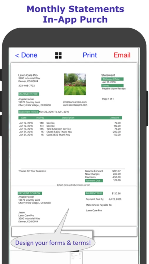 Specifically designed for Landscaping & tree Care Pros, this is a complete invoicing, financial and contact management app designed for service oriented independent businesses. It maintains a client focused schedule of your appointments. Integrated with your client contact info you can quickly create invoices and track your important accounts.