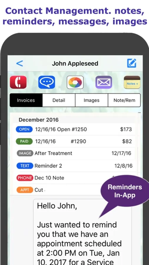 Contact Management - Store notes, images and track other communications with your clients and have the in app ability to call, text, email or map without leaving your app.