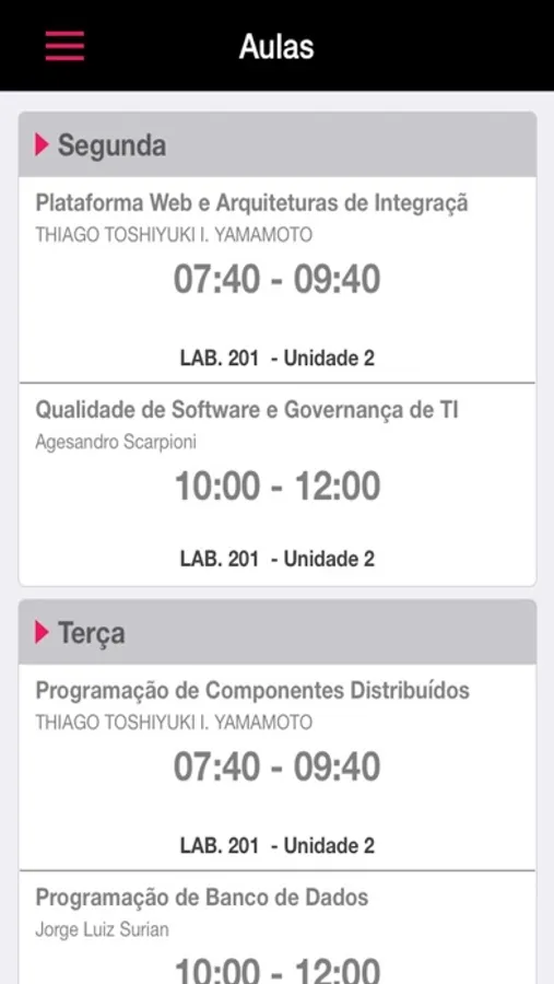Horário e local das aulas de cada disciplina.
