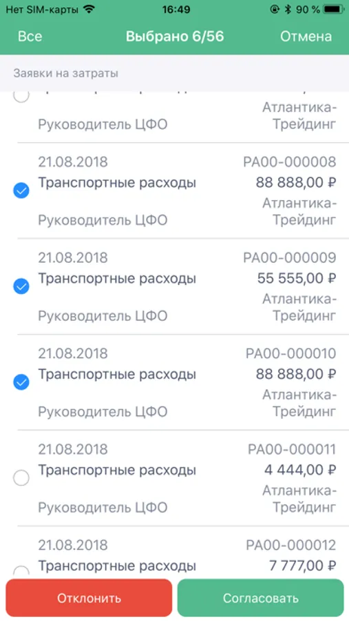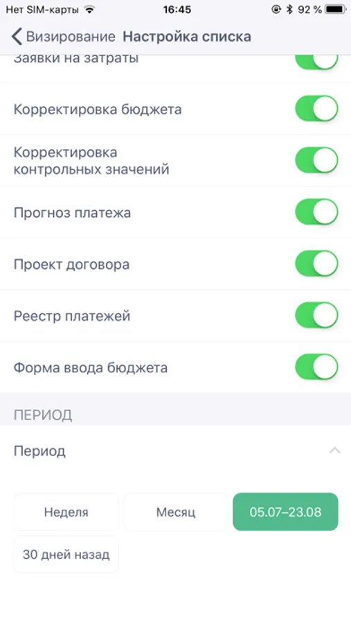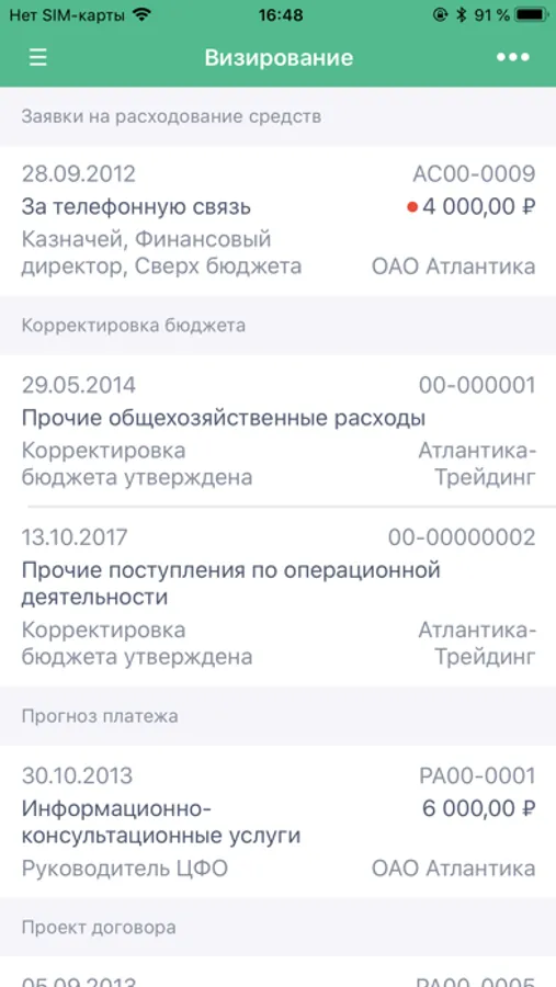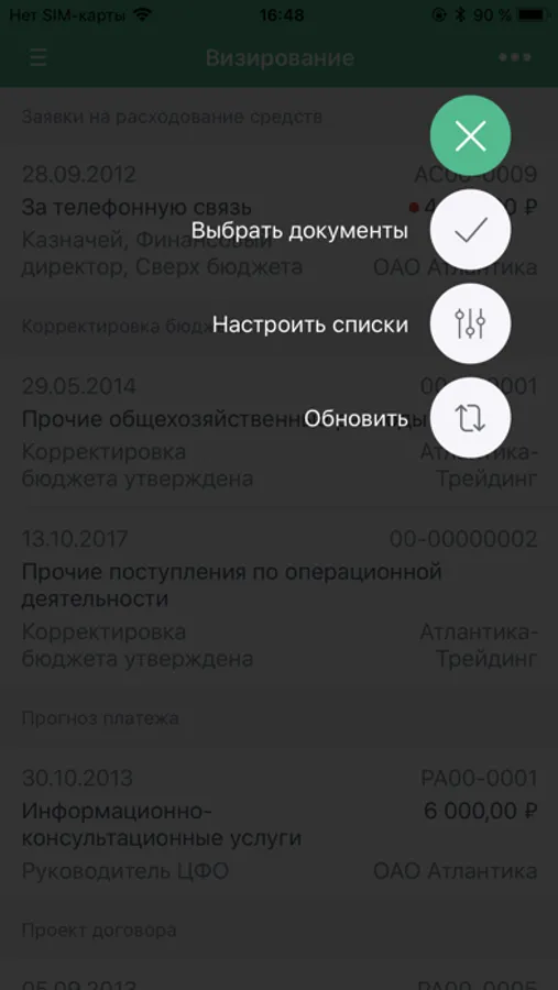 Документы для визирования выводятся для пользователя, указанного в подключении. Предусмотрена возможность отборов по периоду и виду документов.