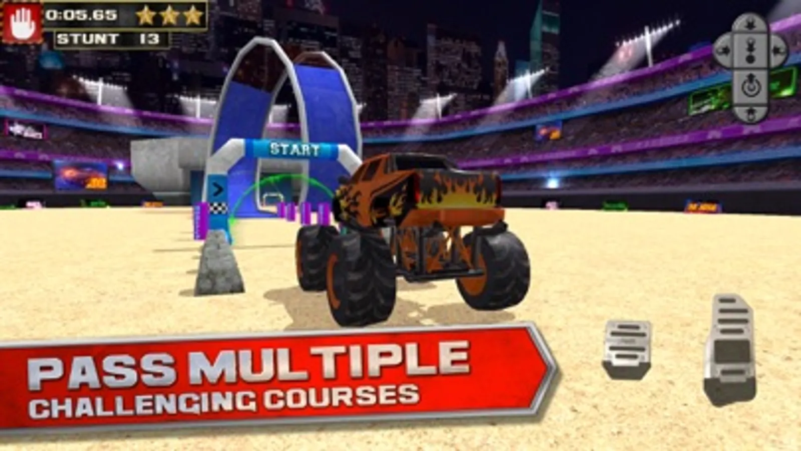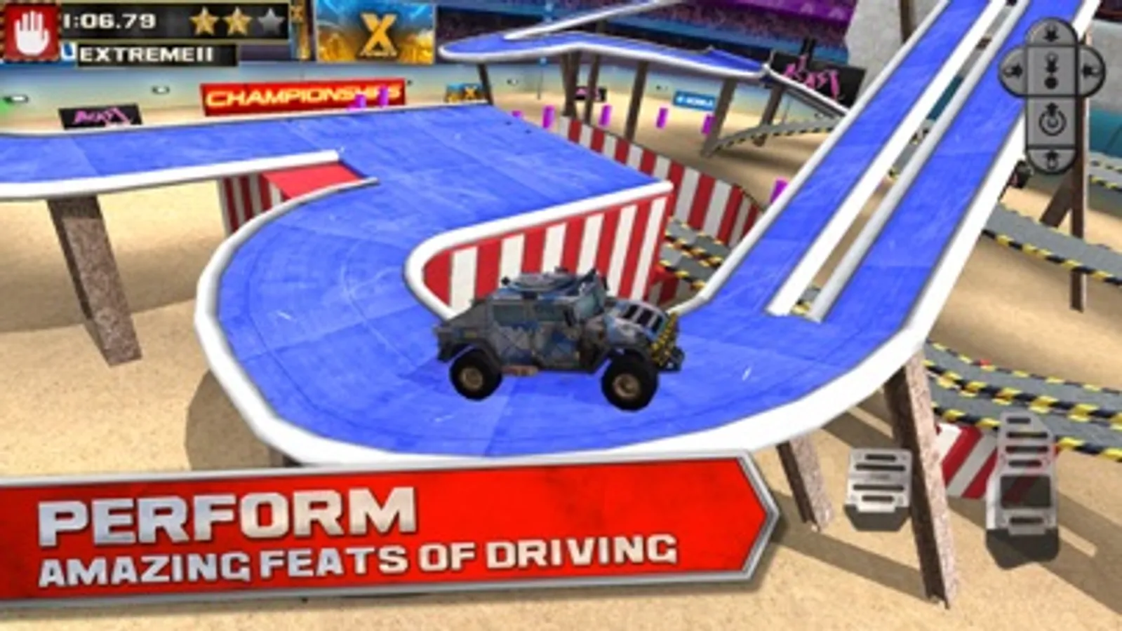 The game features realistic physics with easy controls. Exciting extreme assault courses including “Big Air” Jumps, Hill-Climbs, Raised Platforms, Loop-the-Loops and unbelievable angled roads designed to challenge the real driver in you!