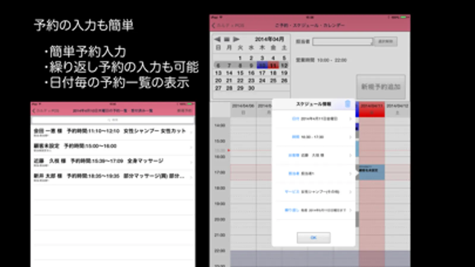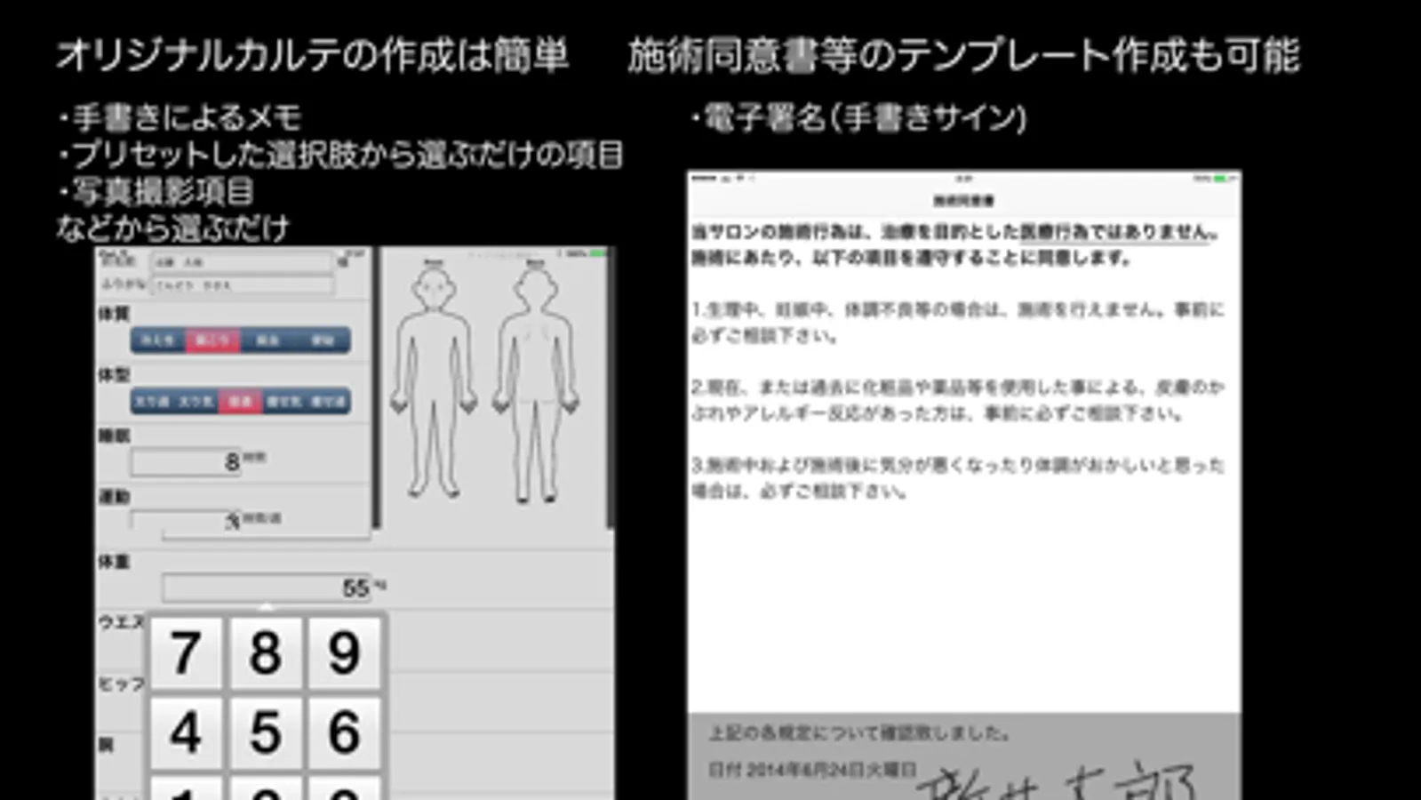 顧客カルテ+POSは、オリジナルなカルテが作成可能なアプリと予約管理、POSを組み合わせた美容室、ネイルサロン、マッサージサロン 整体院等 様々な業種でご利用頂けるアプリです。