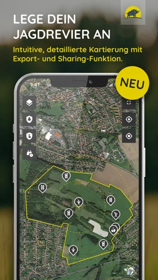 - eine umfassende Revierverwaltung zur Darstellung von Reviergrenzen und Reviereinrichtungen, zum Speichern, Exportieren und Teilen unter Mitjägern
