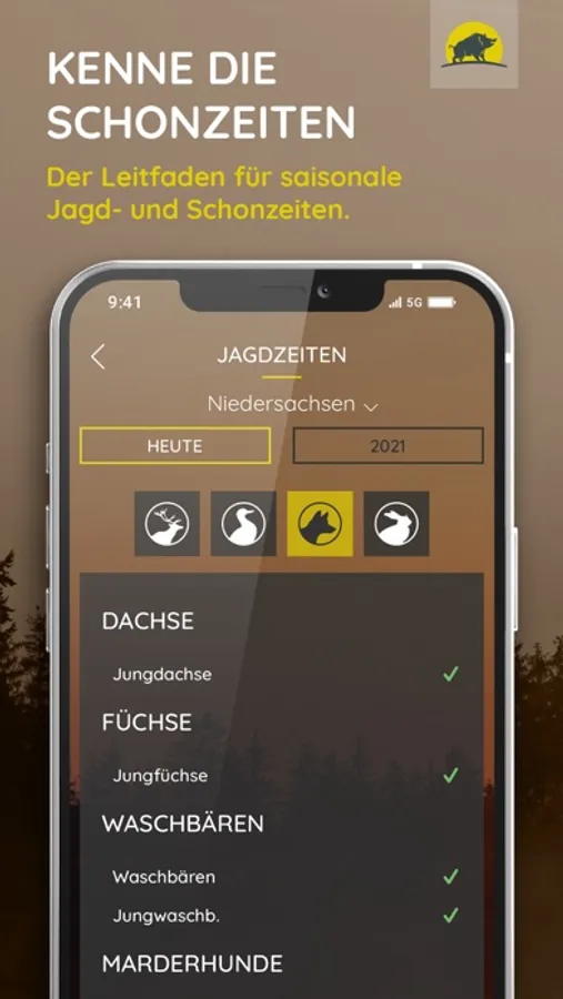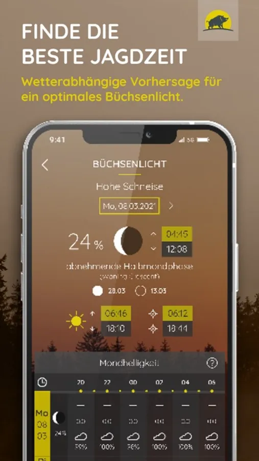 In der Jagdwetter-App findest du neben Wetter- und Wind-Informationen für Dein Revier, ebenso Daten über Mondphasen, Mondhelligkeit sowie Jagdzeiten und Schonzeiten.
