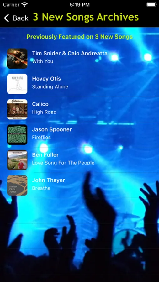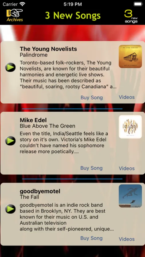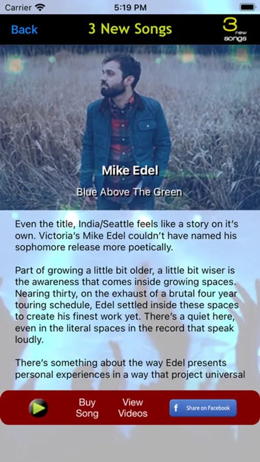 3 New Songs lets you discover new music, 3 songs at a time. If you like what you hear, you can find out more about the artist, purchase the song, view the artists' videos, and post to Facebook.