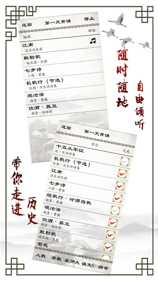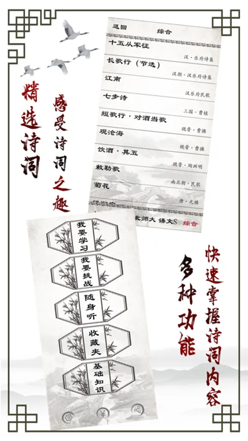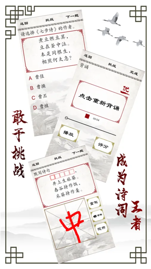 与学习同步,按课程练习,主要从诗词解释、诗词意境理解,诗词缺空填写,诗词背诵四个方面进行挑战。