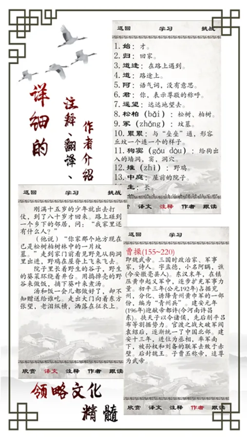 真人发音、动画滚动结合,配合背景音乐,在视觉、听觉上,欣赏诗词所表达的意境。欣赏之后,还有解释、注释、作者生平简介,让孩子更好的理解诗词的意思以及作者内心的想法。