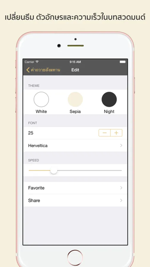 ○ เปลี่ยนแปลงรูปแบบ (Theme) ในหน้าบทสวดมนต์ ปรับขนาดตัวอักษร เปลี่ยนฟอนต์ ปรับความเร็วในการเลื่อนบทสวดมนต์