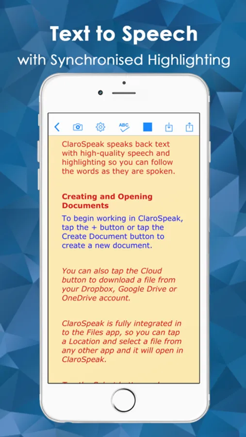 ClaroSpeak is a reading and writing app with high-quality text-to-speech, formatting controls, a wide range of fonts and styles and cloud storage integration.