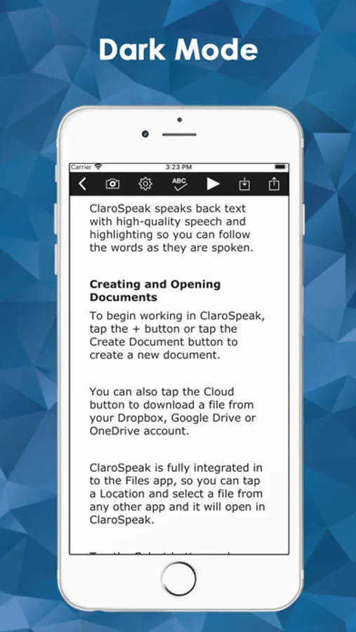 Open documents stored in Dropbox or Google Drive directly in ClaroSpeak. Save text and audio files directly back to Dropbox or Google Drive. Great for transferring files between devices and keeping files in the cloud.